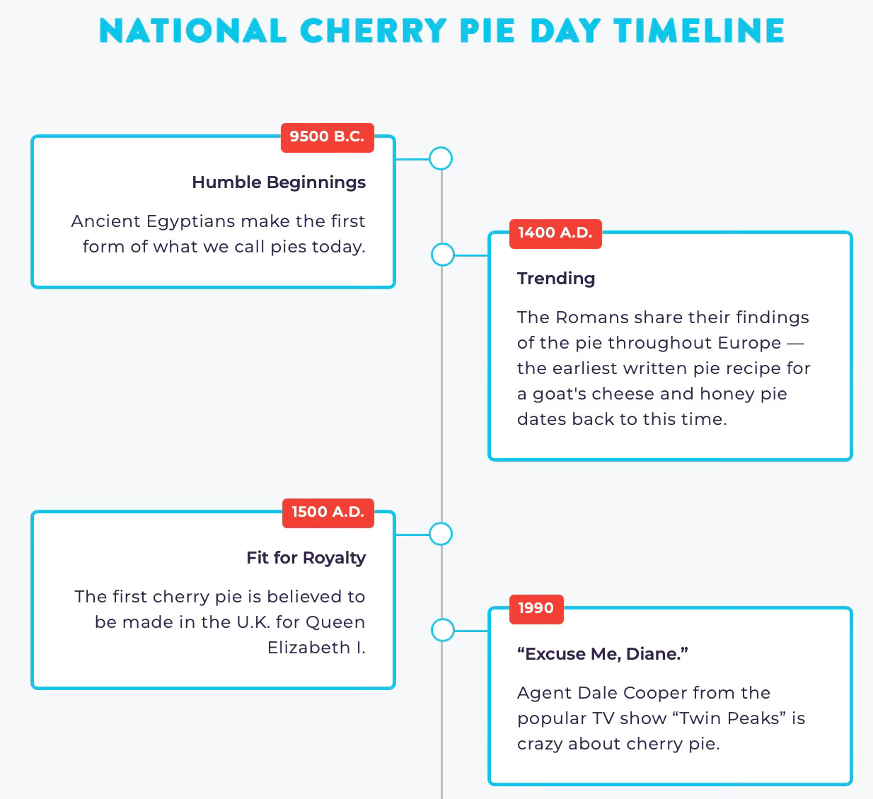 In the 1500s, fruit pies were introduced, and quickly became popular. The cherry pie is believed to have made its first appearance during this time, when it was first presented to Queen Elizabeth I. Cherry pie is believed to have been a favorite of hers during the Tudor era.