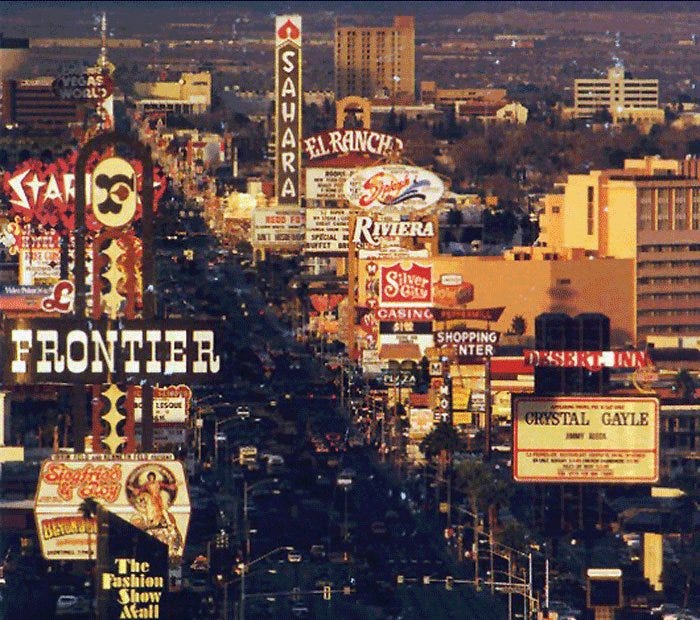 For the record, The Strip is not technically within the Las Vegas city limits. It stretches 4.2 miles southward, immediately south of the Las Vegas city limits through the unincorporated towns of Paradise and Winchester. These days, the area is legally and commonly known as part of the “Las Vegas” metropolitan area, though early casino developers, many of whom were mobsters, built outside the city limits to avoid municipal taxes and regulations- AKA the law.