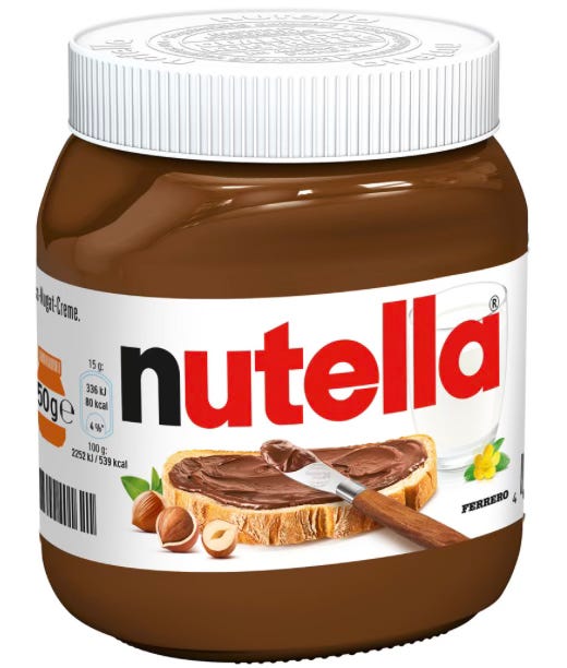 What was new was Signore Ferrero’s loaves of dried chocolate, sugar, & hazelnuts. While Giandujot sold well, by 1951, customers were asking for a more spreadable version. So Ferrero created one, changing the loaf of cocoa, hazelnuts, & sugar into a creamy, spreadable version he renamed “Supercrema gianduja” or more commonly just “Supercrema.”