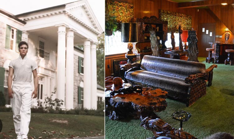 The room was hard to beat. Green shag carpet. Thick drapes making it eternally dark. With furniture from Sears, he had a waterfall built inside and furnished it with plastic plants, rainbow lights and multiple TVs. It was a place where Elvis could, well, be Elvis. It was his hangout where he ate breakfast and recorded some of his last works.