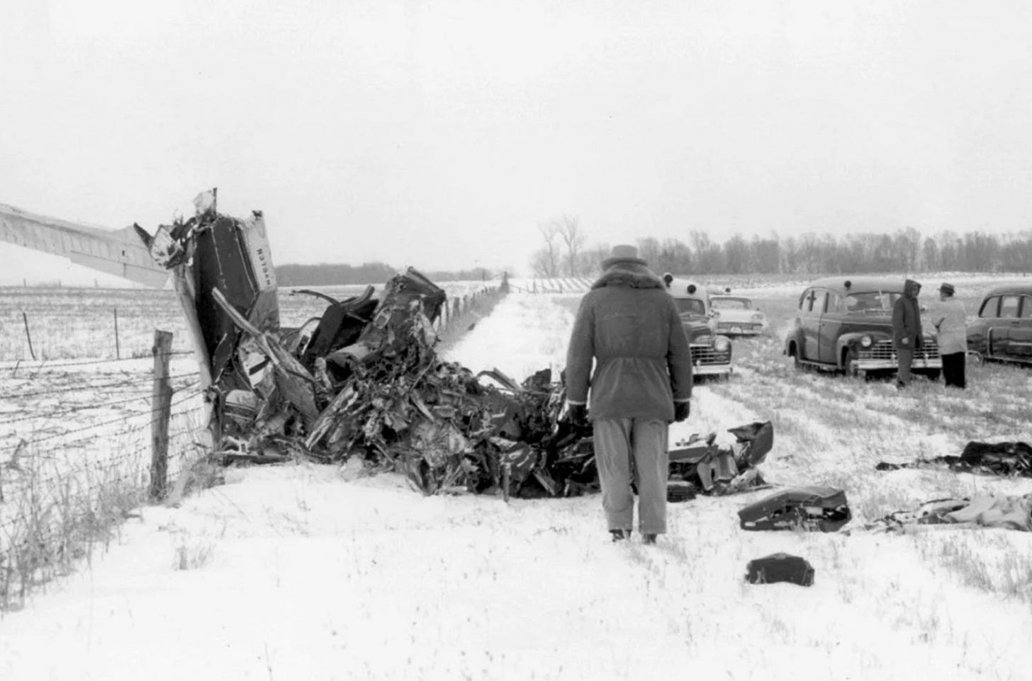 The flight took off from Mason City Municipal Airport at 12:55 AM on February 3. There was a light snowfall on the runway, with sky obscured, and visibility only six miles, but Peterson was not alerted to the worsening weather conditions, and received clearance for takeoff. A few minutes after takeoff, the plane encountered high winds and heavier snow. Peterson quickly lost control of the aircraft, which dipped low to the ground, catching the aircraft’s right wing tip. Air traffic control attempted to make radio contact with Peterson after observing the plane’s taillight descend. It was too late, however; the plane had crashed in a cornfield six miles from the airport. The wreckage was found later that morning by a search and rescue team