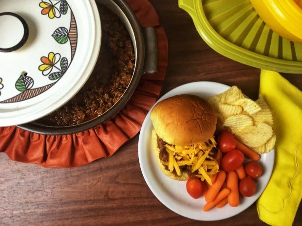 The sloppy joe at its most basic is browned ground beef in a seasoned tomato sauce served on a hamburger bun. The typical recipe for the sauce, which you can find even today, consists of mixing ketchup (or tomato sauce), barbecue sauce, and brown sugar with chili powder. Often the beef is browned with chopped onions, bell peppers, and garlic, with Worcestershire sauce, mustard, and hot sauce sometimes added. A trendy mid-century addition was diced celery added to the ground beef mixture as well as using chili sauce instead of barbecue sauce. Also popular in the 50s and 60s was to spoon the beef mixture onto the bun and either sprinkle with some shredded cheddar or a thin slice of cheese and place them on a baking sheet to bake for twenty minutes at 350F degrees.